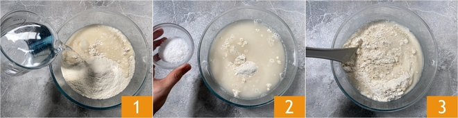 Para preparar la pizza sin levadura, vierte la harina en un bol grande, luego añade el agua 1 y la sal 2. Mezcla todo con una cuchara de madera 3.