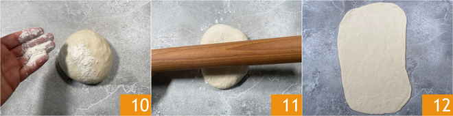Transcurrido este tiempo, toma una bola a la vez, asegurándote de mantener la otra siempre cubierta, y espolvoréala por ambos lados con un poco de harina 10. Estira la masa con el rodillo 11 hasta formar un rectángulo del mismo tamaño que la bandeja 12. Si la masa tiende a retraerse, no la fuerces, espera un par de minutos antes de estirarla nuevamente con el rodillo.