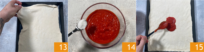 Transfiere la masa a la bandeja bien engrasada con aceite y estírala suavemente para cubrir toda la superficie 13. Ahora sazona el puré de tomate con sal 14 y mezcla bien. Esparce el tomate por toda la superficie de la masa 14, incluidos los bordes.