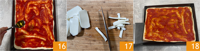 Rocía con un hilo de aceite 15 y cocina la pizza en un horno estático precalentado a 250° durante 10 minutos, colocando la bandeja en contacto con la parte inferior del horno. Mientras tanto, corta la mozzarella en bastoncillos 17. Pasados los 10 minutos, saca la bandeja y transfiere la pizza 18 directamente sobre la rejilla.