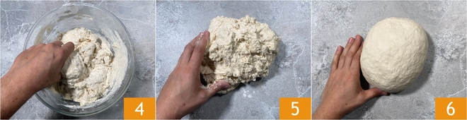 Una vez que la mezcla esté integrada, sigue trabajando con las manos, primero en el bol 4 y luego sobre la superficie de trabajo 5. Debes obtener una masa lisa y homogénea 6.
