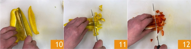 Obtén bastones 7 y finalmente córtalos también en cubos de aproximadamente 1 cm 8. Para el pimiento amarillo: elimina el tallo, luego divídelo por la mitad 9 y quita las semillas y los filamentos internos.<\/p>