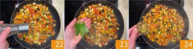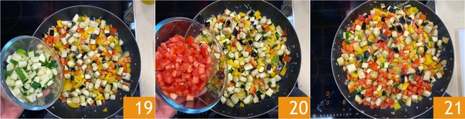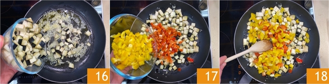 Añade entonces las verduras respetando el orden de cocción: primero la berenjena 16, luego los pimientos 17. Mezcla bien 18.<\/p>