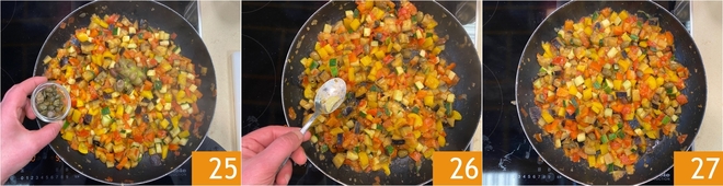Añade también las alcaparras bien desaladas 25. Remueve, elimina el diente de ajo 27 y tu ratatouille está lista 27.<\/p>