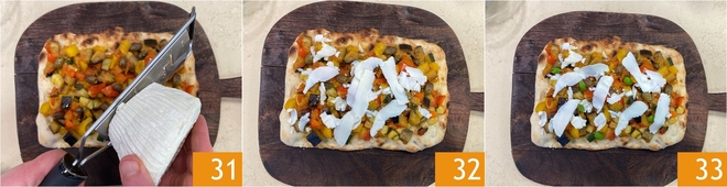 Completa con láminas de ricotta salada 31 32 y albahaca fresca. ¡Tu pinsa vegetariana está lista para ser servida, bien caliente 33!<\/p>