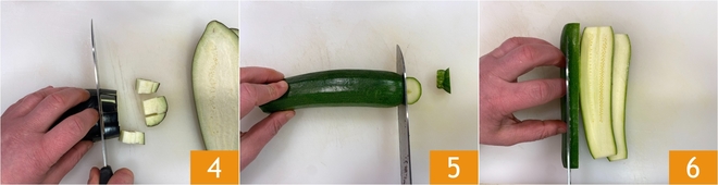 Corta luego los bastones en cubos regulares de aproximadamente 1 cm 4. Pasa ahora a los calabacines: córtales los extremos 5, luego córtalos en rodajas de aproximadamente 1 cm de grosor a lo largo 6.<\/p>