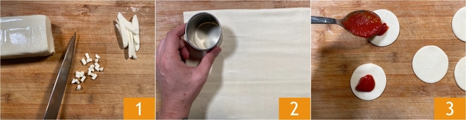 Para preparar las pizzetas de hojaldre en freidora de aire, lo primero que hay que hacer es cortar la mozzarella para pizza en daditos muy pequeños 1. Ahora desenrollad la masa de hojaldre y sacad círculos con ayuda de un cortapastas de 6 cm de diámetro 2. Colocad los discos de hojaldre en la tabla de cortar y distribuid sobre ellos la salsa de tomate 3.