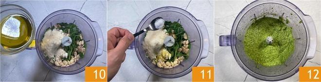 Finalmente, añadid el aceite 10 y la sal 11 y triturad hasta obtener una consistencia cremosa pero bastante rústica 12.