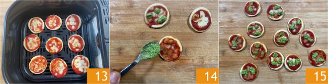 Una vez cocidas 13, adornad las pizzetas de hojaldre con unas gotas de pesto de rúcula 14. ¡Vuestras pizzetas de hojaldre en freidora de aire están listas para ser degustadas 15!