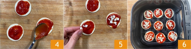 Distribuid uniformemente ayudándoos con el dorso de la cuchara 4, luego añadid los daditos de mozzarella 5. Trasladad las pizzetas así preparadas al cestillo de la freidora de aire 6 y cocinad a 150° durante 6 minutos.
