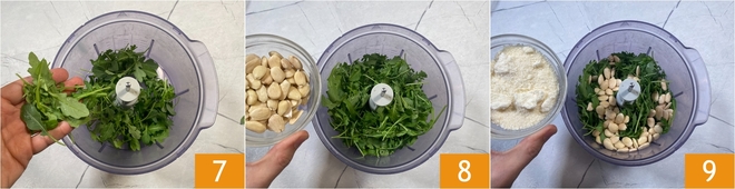 Mientras tanto, ocupáos del pesto de rúcula: poned la rúcula lavada y seca en un procesador de alimentos con cuchillas 7, luego añadid las almendras peladas 8 y el pecorino rallado 9.