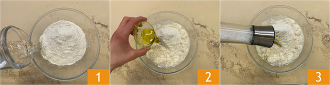 Para preparar las pizzetas sin fermentación con calabaza y zola, comienza con la masa: en un bol vierte la harina, el agua 1, el aceite 2 y la sal 3.
