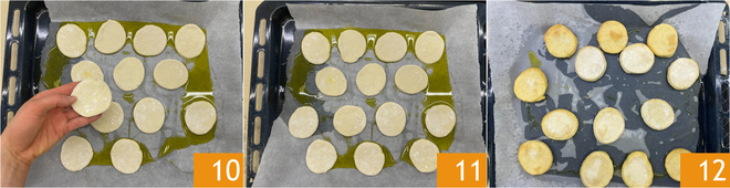Coloca los discos en una bandeja para hornear forrada con papel de horno que habrás engrasado previamente con un poco de aceite 10. Cocina en horno estático a 190° 11 durante unos 15 minutos 12.