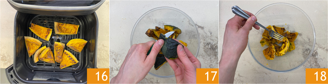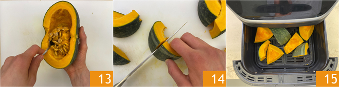 Mientras tanto, ocúpate de la calabaza: elimina las semillas y los filamentos internos 13, luego corta la pulpa en trozos grandes 14. Coloca la calabaza en el cestillo de la freidora de aire 15 y cocina a 180° durante 15 minutos.