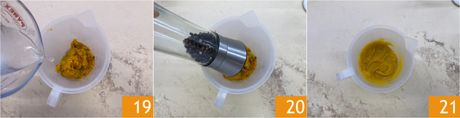 Transfiere la calabaza aplastada al vaso de la batidora, luego añade un poco de agua 19, sal, pimienta y aceite 20. Tritura hasta obtener un puré liso y homogéneo 21.