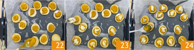Saca las pizzetas del horno y condiméntalas con la crema 22, luego hornea por otros 5 minutos. Pasado este tiempo, completa con el gorgonzola 23 y un hilo de miel 24.