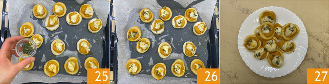 Finalmente adorna con las hojas de tomillo 25 y deja que se templen 26. ¡Tus pizzetas sin fermentación con calabaza y zola están listas para ser disfrutadas 27!
