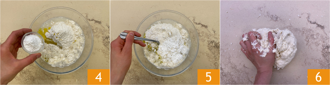 Agrega también la levadura instantánea 4 y comienza a amasar 5. Cuando la mezcla tome consistencia, pásala a la mesa de trabajo y trabaja brevemente con las manos 6.