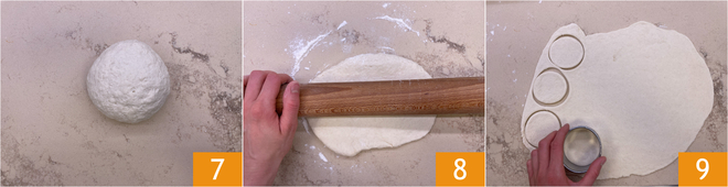 Cuando hayas obtenido una bola lisa 6, extiéndela sobre la mesa ligeramente enharinada con la ayuda de un rodillo 8 hasta obtener una lámina de aproximadamente 3-4 mm de espesor, luego corta discos con un cortador de 7 cm de diámetro 9; con estas cantidades obtendrás unos 16.