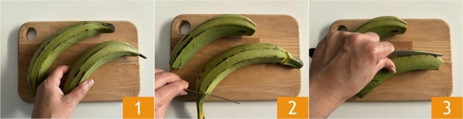 Para preparar el plátano frito, coloca el plátano sobre una tabla de cortar 1 y empieza a pelarlo. Este ingrediente es muy similar a los plátanos, pero no se pela de la misma manera, necesitarás un cuchillo. Toma el cuchillo y corta y elimina los extremos 2, luego haz incisiones a lo largo del plátano en varios puntos 3, para poder quitar la piel de manera más sencilla.