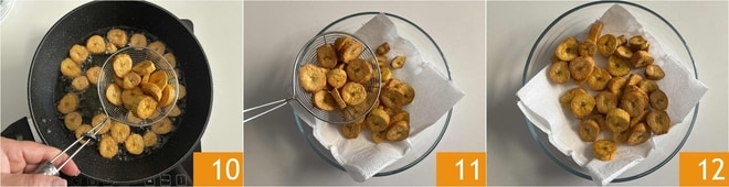 Cocina el plátano durante aproximadamente 4-5 minutos, volteándolo de vez en cuando, para obtener un dorado uniforme. Una vez que el plátano esté perfectamente dorado, escúrrelo del aceite 10 y colócalo sobre papel absorbente 11, para eliminar el exceso de aceite 12.