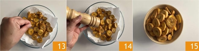 El plátano frito está listo, solo te queda añadir una pizca de sal 13 y una pizca de pimienta 14 y llevarlo a la mesa 15.