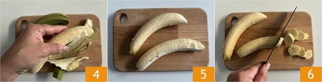 Después de haber quitado completamente la piel 4 5, corta el plátano en rodajas de aproximadamente medio cm 6.