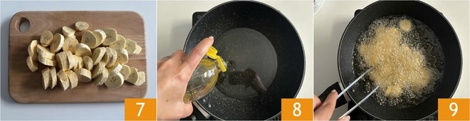 Una vez obtenidas todas las rodajas de plátano 7, vierte abundante aceite de cacahuete en una sartén grande, caliéntalo hasta alcanzar una temperatura de 170° 8. Cuando esté bien caliente, sumerge las rodajas de plátano 9, teniendo cuidado de añadir pocas a la vez. Puedes controlar la temperatura con un termómetro de cocina; si no tienes uno, pon una sola rodaja de plátano en el aceite, para ver si está lo suficientemente caliente para comenzar la cocción.