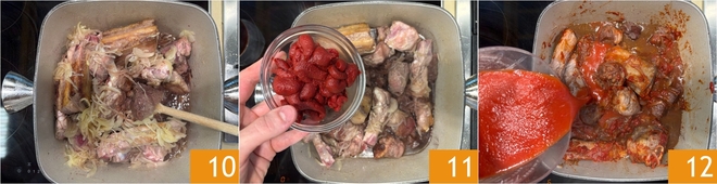 Deja reducir el vino aproximadamente a la mitad, no debe evaporarse completamente 10. En este punto, añade el concentrado de tomate 11 y el puré de tomate 12.