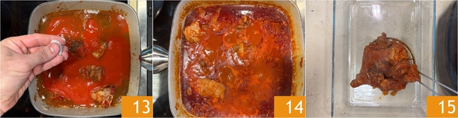 Sala 13 y deja cocinar el ragú a fuego lento durante unas 3 horas 14. Transcurrido este tiempo, retira la carne de la salsa 15.