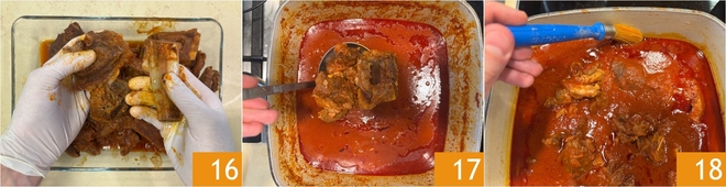 Deshuesa y deshilacha la carne con las manos 16, luego colócala nuevamente en la cazuela con la salsa 17 y continúa la cocción durante otras 3 horas a fuego medio-bajo. Durante la cocción, puedes pincelar los bordes con un poco de agua para eliminar la costra que tiende a formarse 18.