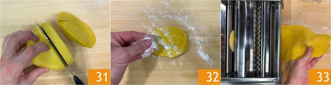 Retoma la masa de pasta fresca del frigorífico y divídela en porciones más pequeñas 31. Extiende una porción a la vez, asegurándote de mantener el resto cubierto. Espolvorea la masa con un poco de harina 32 y pásala por la máquina de pasta comenzando con el grosor más ancho 33.