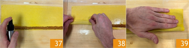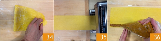 Dobla la hoja para reforzarla 34 y pásala nuevamente por la máquina reduciendo gradualmente el grosor hasta llegar al más fino 35. Coloca la hoja sobre la superficie de trabajo y exprime el relleno a lo largo de toda la longitud 36.