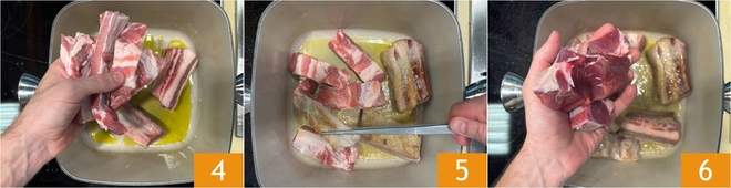 Mientras tanto, prepara la carne: incide el costillar, luego corta la copa de cerdo y el hombro en trozos más pequeños. Las costillas puedes dejarlas enteras. Sala la carne y dórela en una cazuela grande con el aceite bien caliente 4. Gira los trozos de carne por todos los lados para que se forme una buena costra 5. Si la cazuela no es lo suficientemente amplia, puedes retirar poco a poco la carne ya tostada para hacer espacio a la que aún queda por dorar 6, y luego unirla posteriormente al resto.