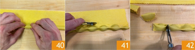 Pellizca la hoja a los lados del relleno para formar los plin 40, luego córtalos con una rueda dentada primero a lo largo 41 y luego para separarlos uno del otro 42. Continúa de esta manera hasta agotar toda la masa.