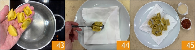 Ahora lleva a ebullición una olla de agua salada y cocina los plin durante un par de minutos 43. Escurre los raviolis directamente sobre la servilleta que habrás colocado sobre un plato caliente 44. ¡Sirve tus plin rellenos de ragú napolitano con el ragú reservado o con una salsa a base de nata y Parmigiano 45!