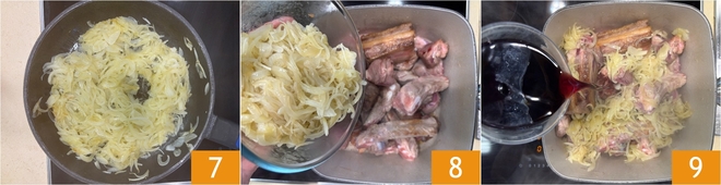 Mientras tanto, las cebollas estarán bien pochadas 7, así que viértelas en la cazuela con la carne 8. Dora todo durante unos minutos para amalgamar los sabores, luego desglasa con el vino tinto 9.