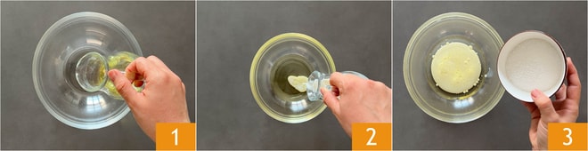 Para preparar el plumcake con claras sobrantes, en un cuenco verted el aceite de semillas 1, la leche 2 y el azúcar 3.