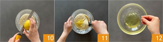 Añadid la cáscara rallada del limón 10 y mezclad con una espátula para incorporarla 11. Verted las claras en un cuenco y añadid una pizca de sal 12.