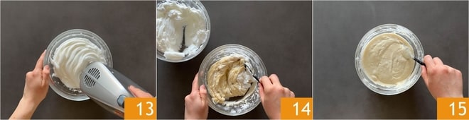 Montad las claras a punto de nieve 13. Incorporadlas a la masa poco a poco con movimientos de abajo hacia arriba 14, para no desmontarlas; deberéis obtener una mezcla bien montada 15.