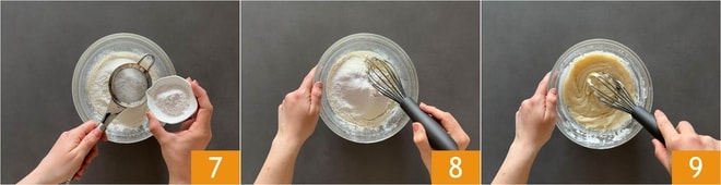 Tamizad también la levadura 7 y mezclad siempre con la varilla 8 hasta obtener una mezcla densa y lisa 9.