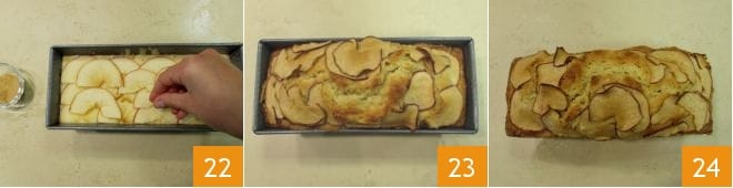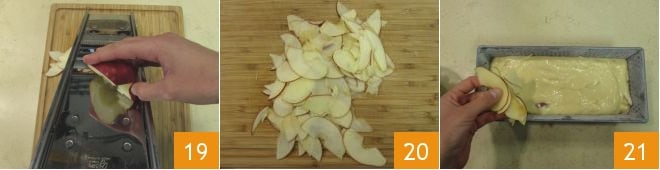 Unta con mantequilla y enharina un molde para plumcake y llénalo con la masa. Con una mandolina corta la media manzana restante en rodajas de aproximadamente 3 mm (19-20). Decora la superficie del plumcake con las rodajas de manzana 21 cubriendo toda la superficie.