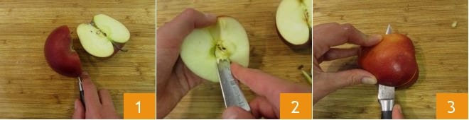 Para preparar el plumcake de manzana, lava y corta por la mitad las manzanas 1, luego elimina las semillas y el corazón 2. Corta 1 manzana y media a lo largo 3,