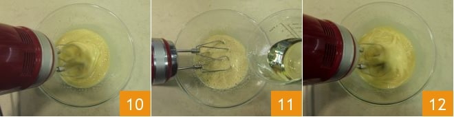 trabaja durante un par de minutos con las varillas eléctricas 10, luego añade el aceite de semillas 11 y continúa trabajando para amalgamarlo todo 12.