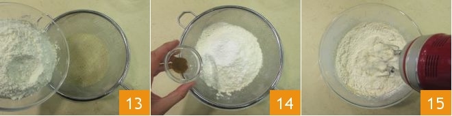 Tamiza la harina 13 y la levadura en el bol, añade también la canela 14 y trabaja de nuevo con las varillas eléctricas 15