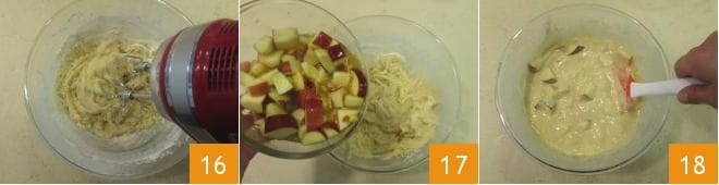 para obtener una mezcla lisa y homogénea 16. Añade las manzanas que habías dejado macerar con azúcar y zumo de naranja 17 y mezcla con una espátula para incorporarlas a la masa 18.