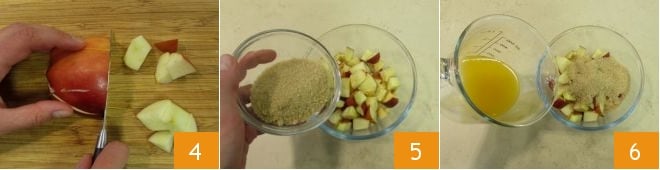 de esta manera será más fácil cortarla en cubitos regulares de aproximadamente 1 cm 4. Coloca los trozos de manzana en un bol, añade 50 g de azúcar moreno 5 y el zumo de una naranja exprimida y colada 6.
