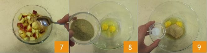 Mezcla y reserva 7. Mientras tanto, en un bol vierte los huevos, 100 g de azúcar moreno 8 y la sal 9,