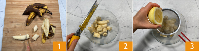 Para preparar el plumcake de plátano y arándanos, comienza con los plátanos, preferiblemente muy maduros: pélalos y corta 375 g de pulpa en trozos grandes 1, luego colócala en un bol. Añade la ralladura de limón 2 y el jugo exprimido y colado 3.