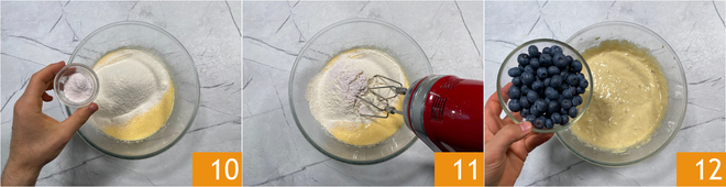 Añade el bicarbonato 10 y mezcla brevemente con las varillas, justo el tiempo de integrar todo 11. Por último, añade los arándanos 12.